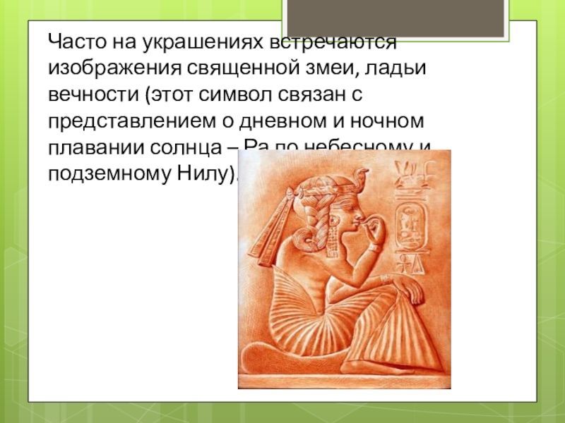 Слайд 5Часто на украшениях встречаются изображения священной змеи, ладьи вечности (этот символ