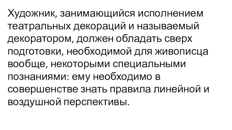 Слайд 4Художник, занимающийся исполнением театральных декораций и называемый декоратором, должен обладать сверх