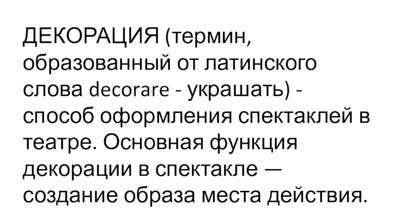 ДЕКОРАЦИЯ (термин, образованный от латинского слова decorare - украшать) - способ оформления спектаклей в театре. Основная функция декорации в спектакле — создание образа места действия.