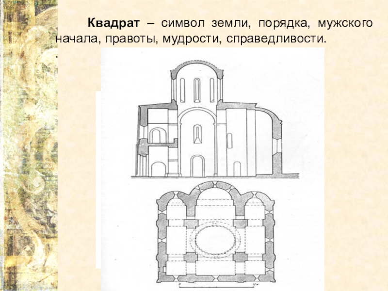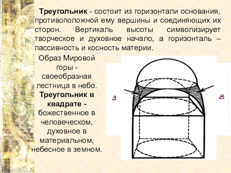 Образ Мировой горы - своеобразная лестница в небо. Треугольник в квадрате - божественное в человеческом, духовное в материальном, небесное в земном.