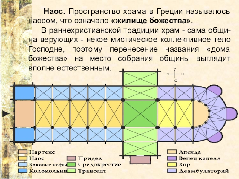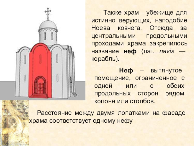 Неф – вытянутое помещение, ограниченное с одной или с обеих продольных сторон рядом колонн или столбов.