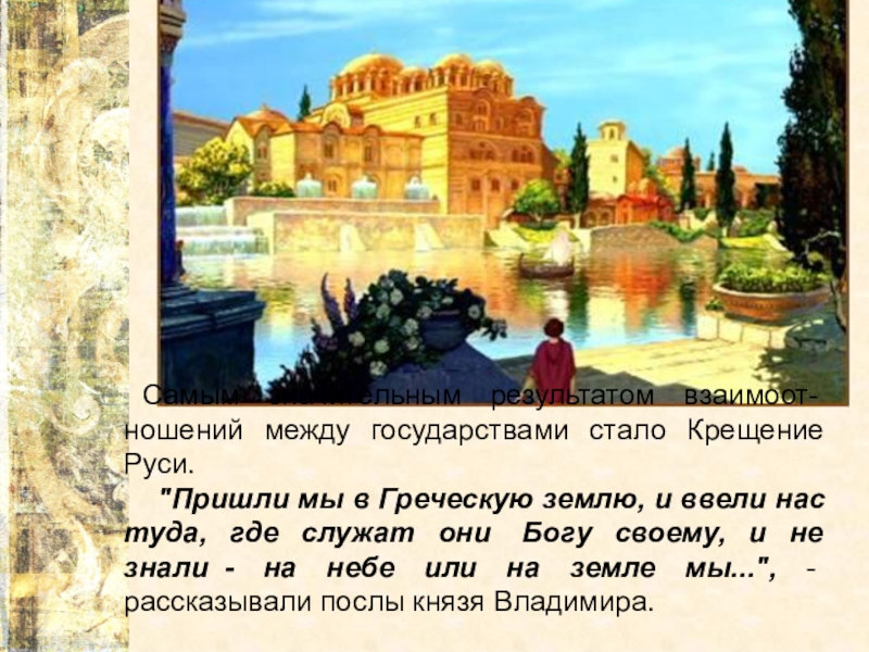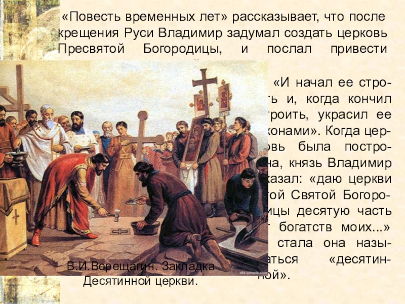 «Повесть временных лет» рассказывает, что после крещения Руси Владимир задумал создать церковь Пресвятой Богородицы, и послал привести мастеров из греческой земли.