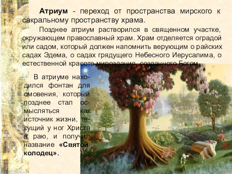 В атриуме нахо-дился фонтан для омовения, который позднее стал ос-мысляться как источник жизни, те-кущий у ног Христа в раю, и получил название «Святой колодец».