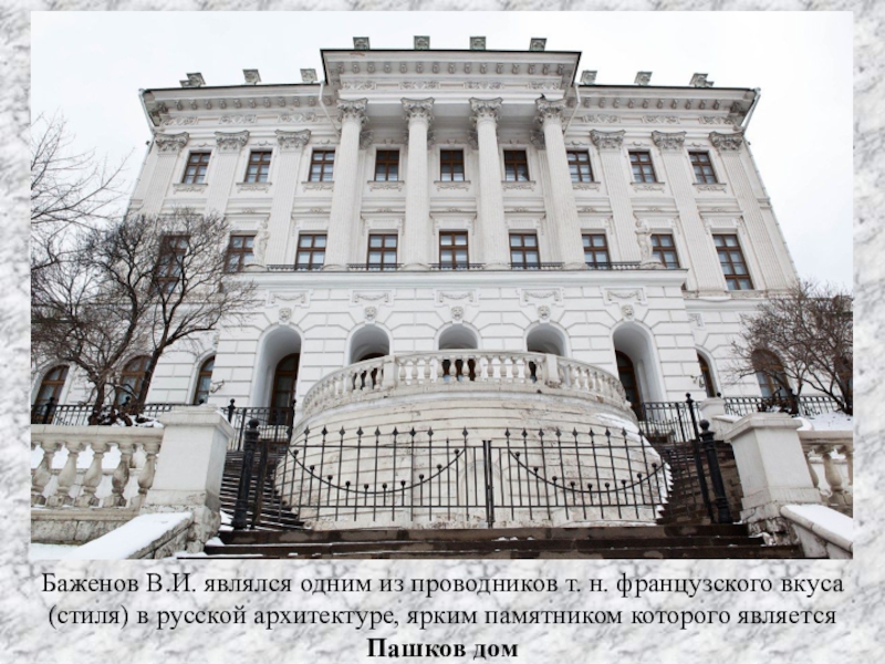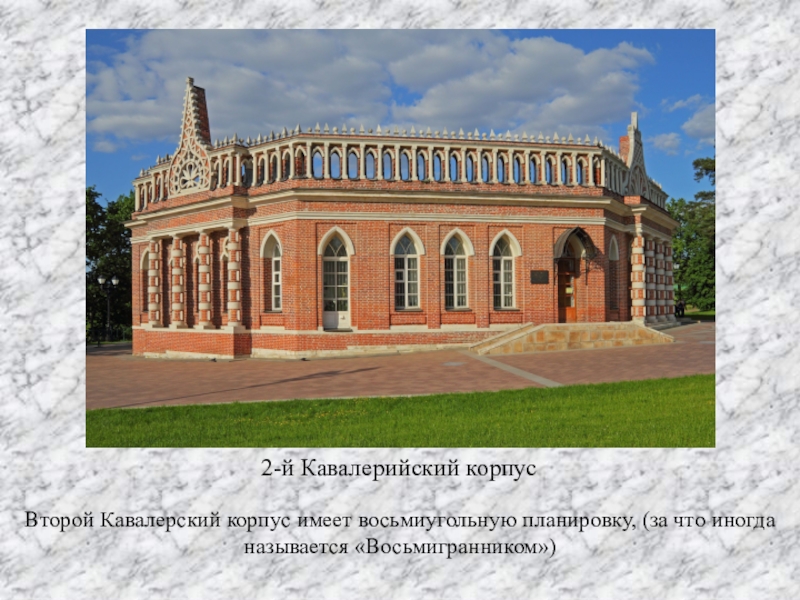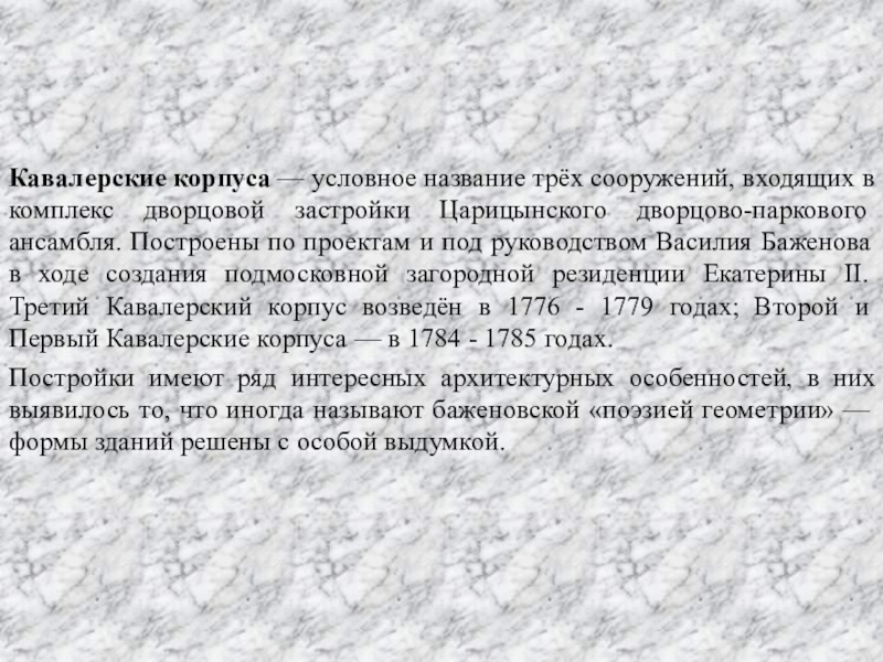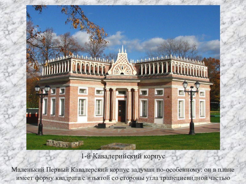 Постройки имеют ряд интересных архитектурных особенностей, в них выявилось то, что иногда называют баженовской «поэзией геометрии» — формы зданий решены с особой выдумкой.