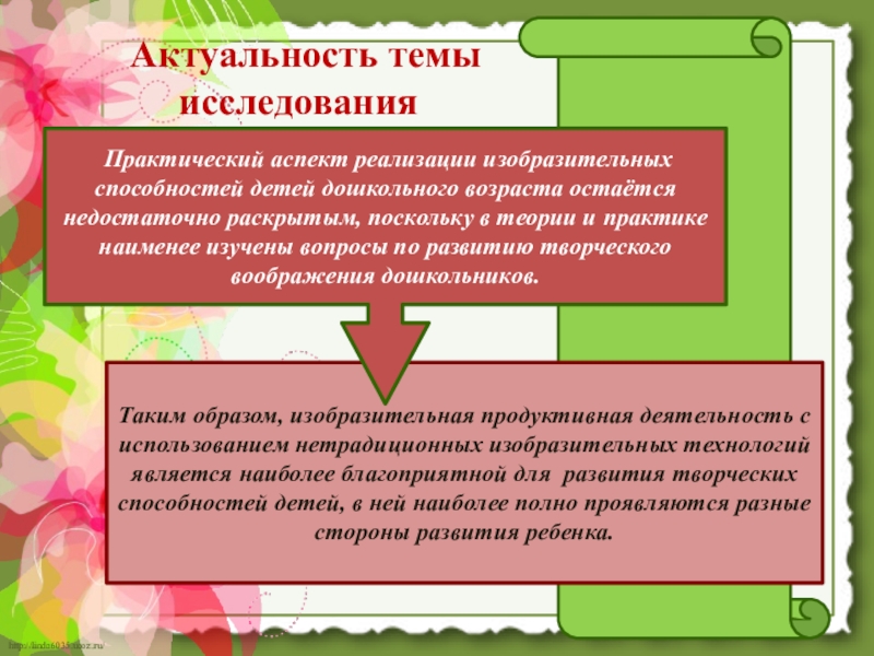 Практический аспект реализации изобразительных способностей детей дошкольного возраста остаётся недостаточно раскрытым, поскольку в теории и практике наименее изучены вопросы по развитию творческого воображения дошкольников.