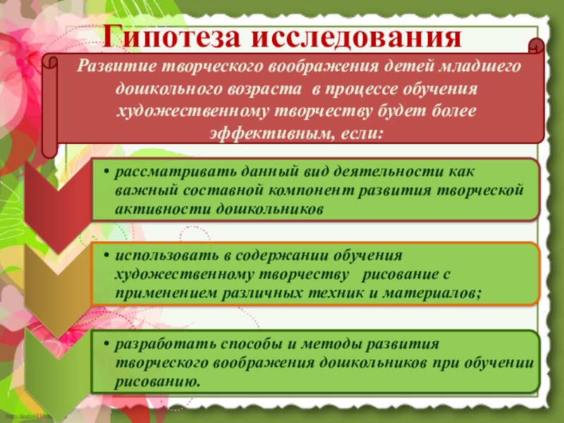 Слайд 3 Состоит в выявлении педагогических условий, способствующих формированию творческого воображения младших