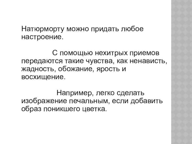 На картинах этого направления искусства принято изображать неодушевленные предметы (в отличие от пейзажной или портретной живописи).