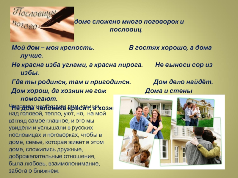 Человеку необходим дом, крыша над головой, тепло, уют, но, на мой взгляд самое главное, и это мы увидели и услышали в русских пословицах и поговорках, чтобы в доме, семье, которая живёт в этом доме, сложились дружные, доброжелательные отношения, была любовь, взаимопонимание, забота о ближнем.
