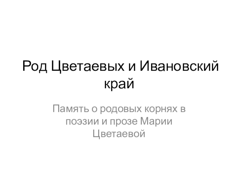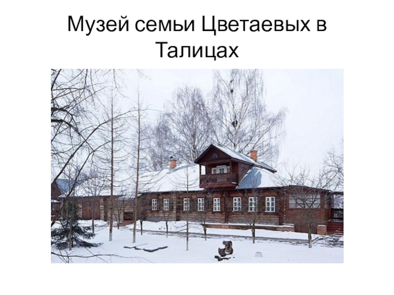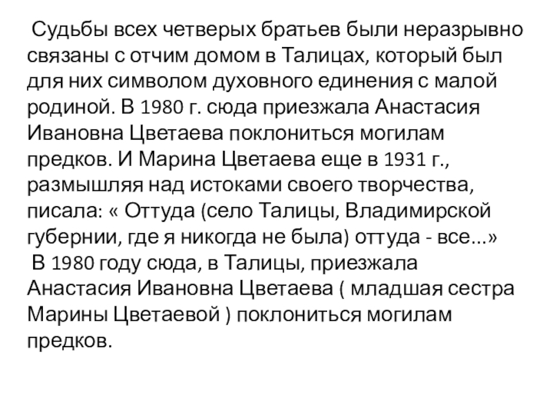 Талицах, который был для них символом духовного единения с малой родиной. В 1980 г. сюда приезжала Анастасия Ивановна Цветаева поклониться могилам предков. И Марина Цветаева еще в 1931 г., размышляя над истоками своего творчества, писала: « Оттуда (село Талицы, Владимирской губернии, где я никогда не была) оттуда - все...»