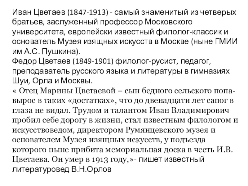 « Отец Марины Цветаевой – сын бедного сельского попа- вырос в таких «достатках», что до двенадцати лет сапог в глаза не видал. Трудом и талантом Иван Владимирович пробил себе дорогу в жизни, стал известным филологом и искусствоведом, директором Румянцевского музея и основателем Музея изящных искусств, у подъезда которого ныне прибита мемориальная доска в честь И.В.Цветаева. Он умер в 1913 году,»- пишет известный литературовед В.Н.Орлов
