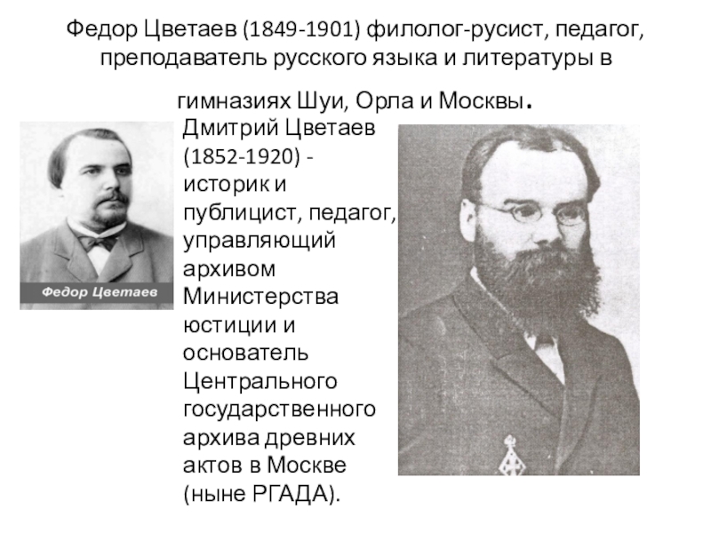 Федор Цветаев (1849-1901) филолог-русист, педагог, преподаватель русского языка и литературы в гимназиях Шуи, Орла и Москвы.