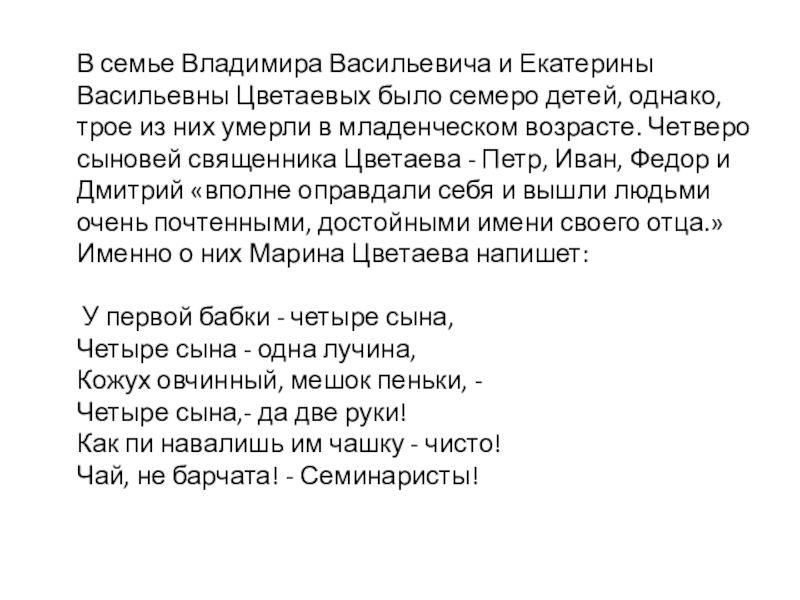 однако, трое из них умерли в младенческом возрасте. Четверо сыновей священника Цветаева - Петр, Иван, Федор и Дмитрий «вполне оправдали себя и вышли людьми очень почтенными, достойными имени своего отца.» Именно о них Марина Цветаева напишет: