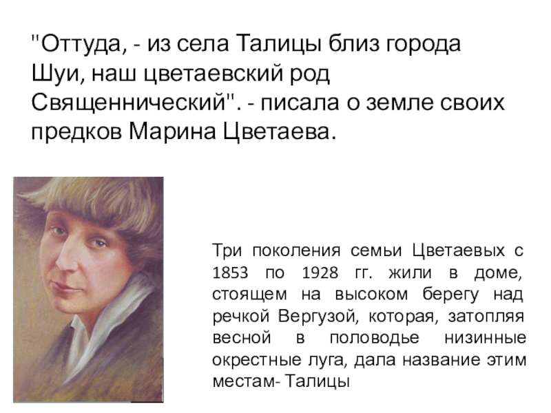 "Оттуда, - из села Талицы близ города Шуи, наш цветаевский род Священнический". - писала о земле своих предков Марина Цветаева.