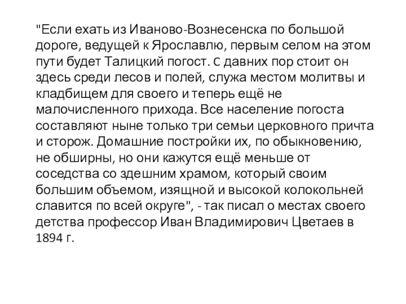 Слайд 3"Если ехать из Иваново-Вознесенска по большой дороге, ведущей к Ярославлю, первым