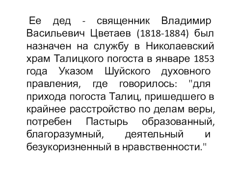 Слайд 5 Ее дед - священник Владимир Васильевич Цветаев (1818-1884) был назначен на
