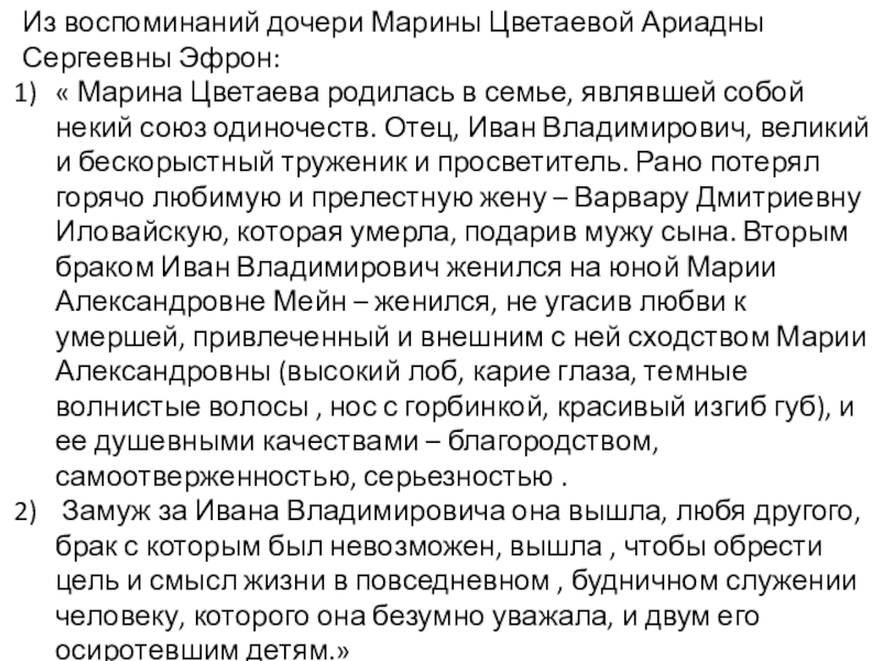 Слайд 10Из воспоминаний дочери Марины Цветаевой Ариадны Сергеевны Эфрон: