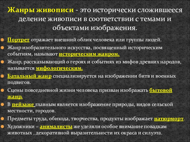 Жанры живописи - это исторически сложившееся деление живописи в соответствии с темами и объектами изображения.