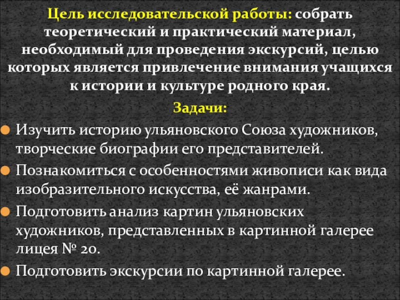 Цель исследовательской работы: собрать теоретический и практический материал, необходимый для проведения экскурсий, целью которых является привлечение внимания учащихся к истории и культуре родного края.