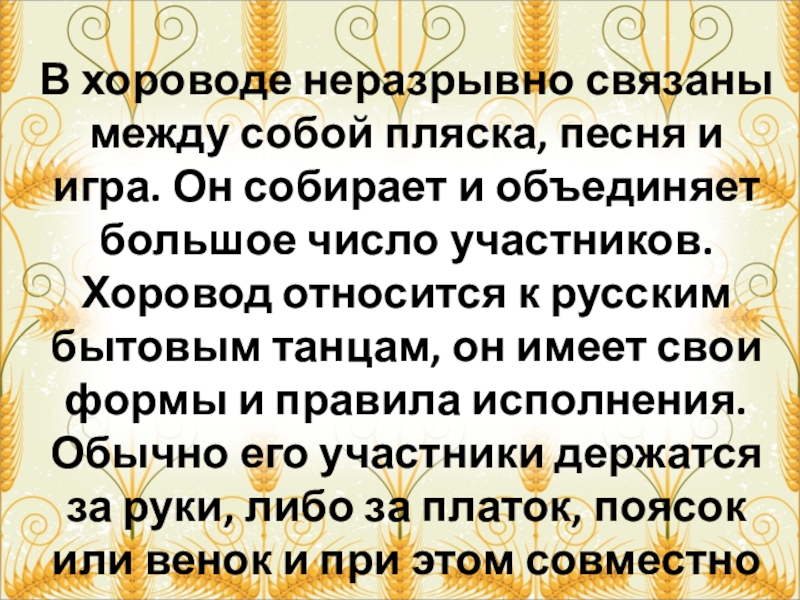 собирает и объединяет большое число участников. Хоровод относится к русским бытовым танцам, он имеет свои формы и правила исполнения. Обычно его участники держатся за руки, либо за платок, поясок или венок и при этом совместно исполняют хороводную песню.
