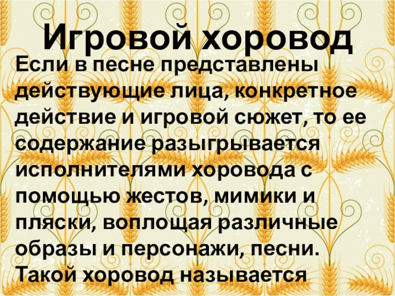Игровой хороводЕсли в песне представлены действующие лица, конкретное действие и игровой сюжет, то ее содержание разыгрывается исполнителями