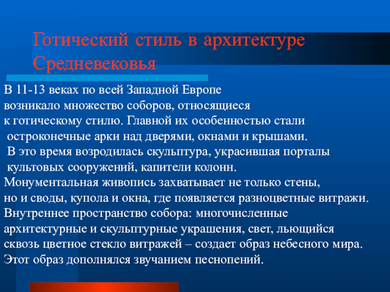 Готический стиль в архитектуре СредневековьяВ 11-13 веках по всей Западной Европе возникало множество соборов, относящиеся к готическому
