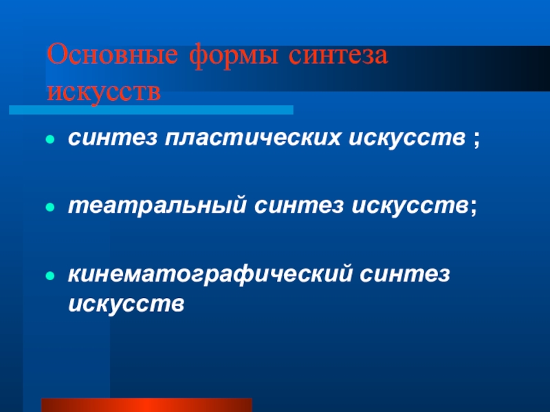 Основные формы синтеза искусств синтез пластических искусств ;театральный синтез искусств;кинематографический синтез искусств