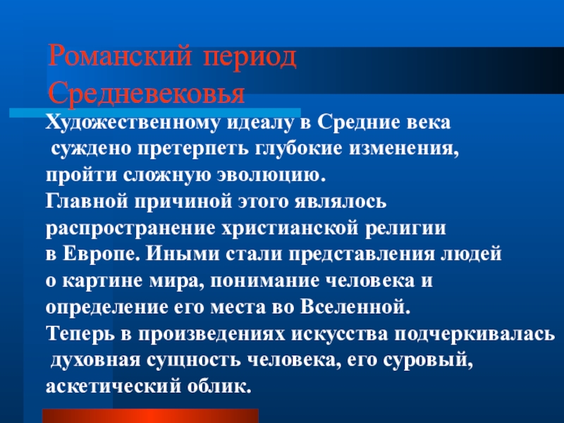 Романский период  СредневековьяХудожественному идеалу в Средние века суждено претерпеть глубокие изменения, пройти сложную эволюцию. Главной причиной