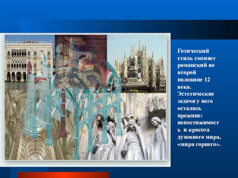 Готический стиль сменяет романский во второй половине 12 века.Эстетические задачи у него остались прежние: непостижимость и красотадуховного