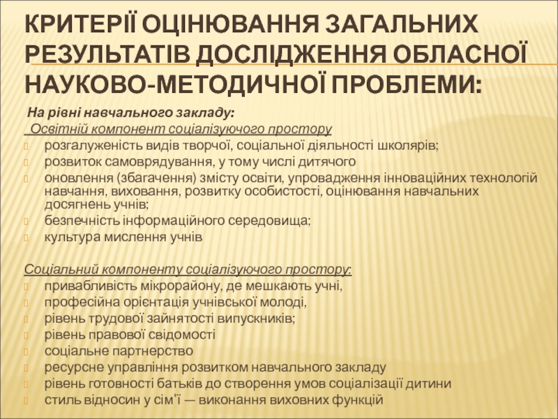 Слайд 11КРИТЕРІЇ ОЦІНЮВАННЯ ЗАГАЛЬНИХ РЕЗУЛЬТАТІВ ДОСЛІДЖЕННЯ ОБЛАСНОЇ НАУКОВО-МЕТОДИЧНОЇ ПРОБЛЕМИ: