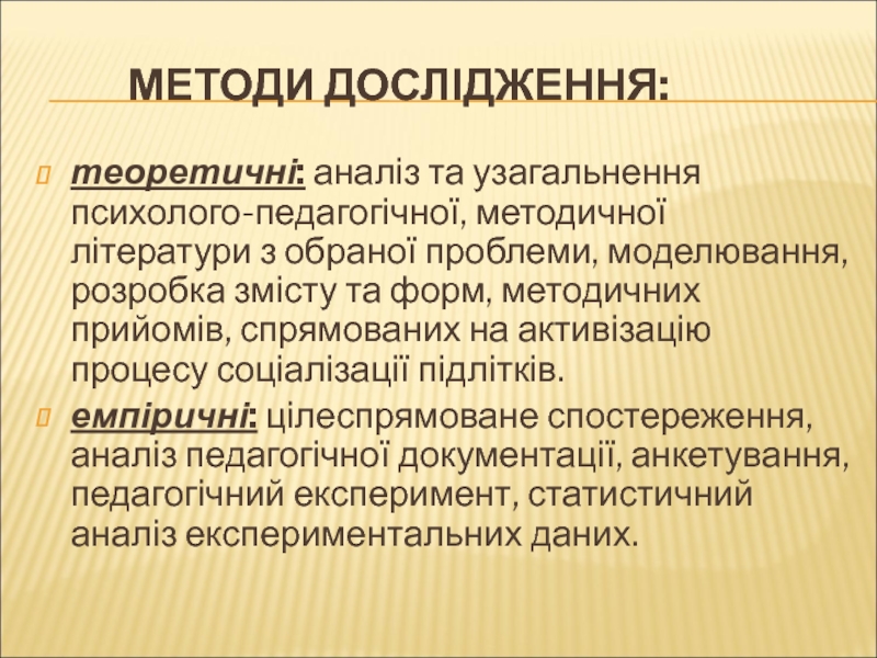 емпіричні: цілеспрямоване спостереження, аналіз педагогічної документації, анкетування, педагогічний експеримент, статистичний аналіз експериментальних даних.