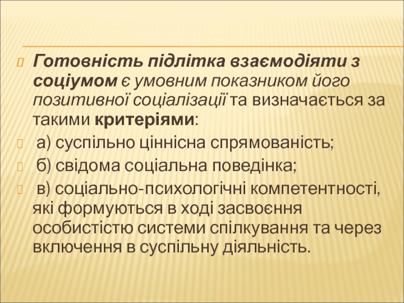 Слайд 9Готовність підлітка взаємодіяти з соціумом є умовним показником його позитивної соціалізації