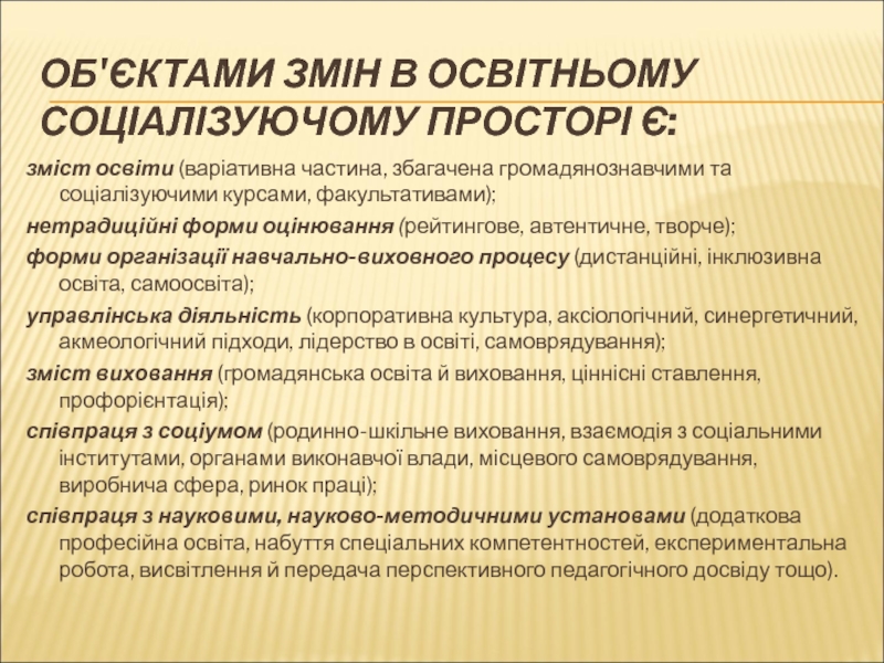 Слайд 8ОБ'ЄКТАМИ ЗМІН В ОСВІТНЬОМУ СОЦІАЛІЗУЮЧОМУ ПРОСТОРІ Є:
