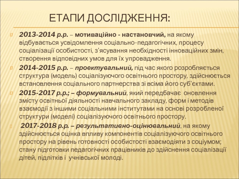 2015-2017 р.р.; – формувальний, який передбачає оновлення змісту освітньої діяльності навчального закладу, форм і методів взаємодії з іншими соціальними інститутами на основі розробленої структури (моделі) соціалізуючого освітнього простору.