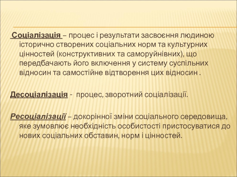 норм та культурних цінностей (конструктивних та саморуйнівних), що передбачають його включення у систему суспільних відносин та самостійне відтворення цих відносин .