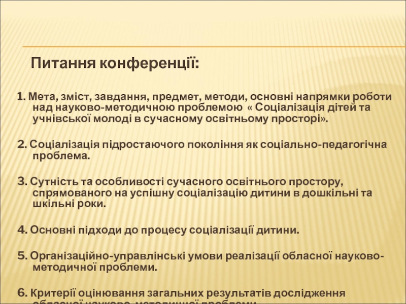 1. Мета, зміст, завдання, предмет, методи, основні напрямки роботи над науково-методичною проблемою « Соціалізація дітей та учнівської молоді в сучасному освітньому просторі».