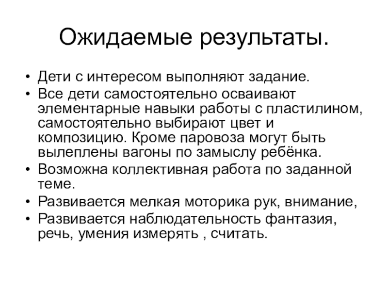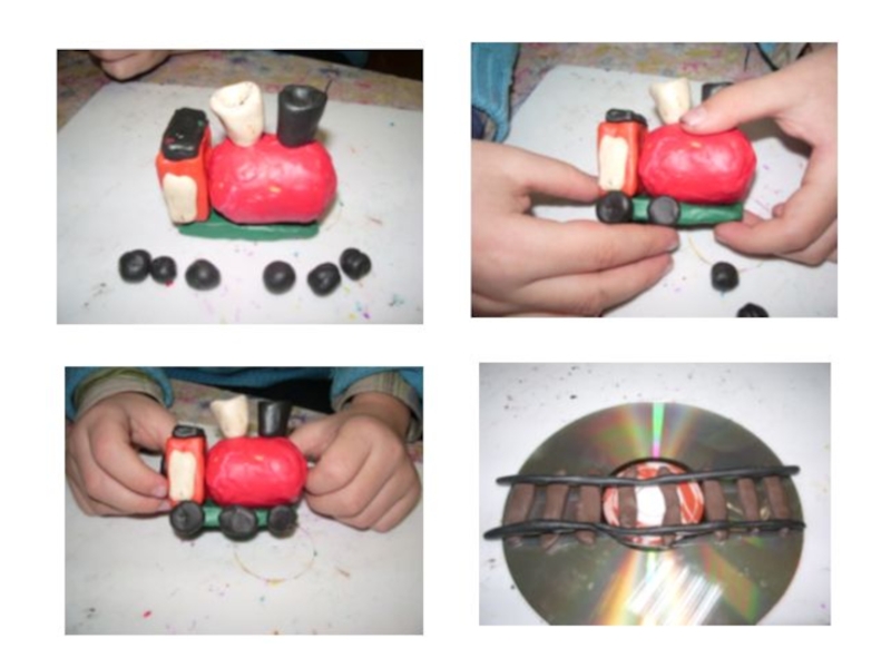 навыки работы с пластилином, самостоятельно выбирают цвет и композицию. Кроме паровоза могут быть вылеплены вагоны по замыслу ребёнка.