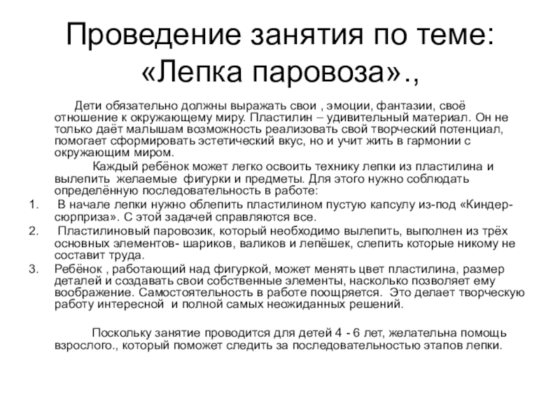 Слайд 4Проведение занятия по теме: «Лепка паровоза».,