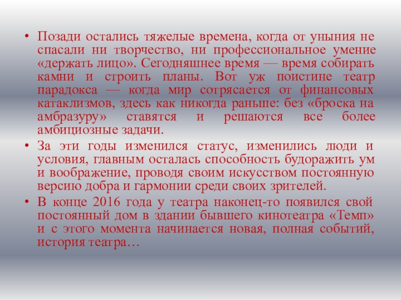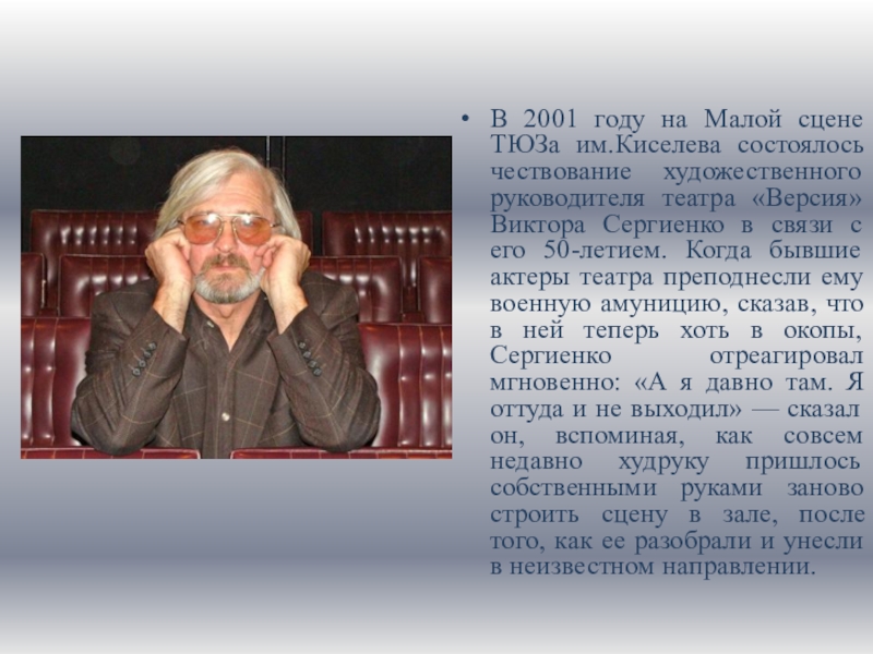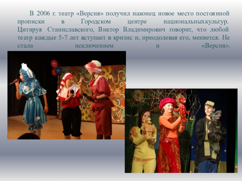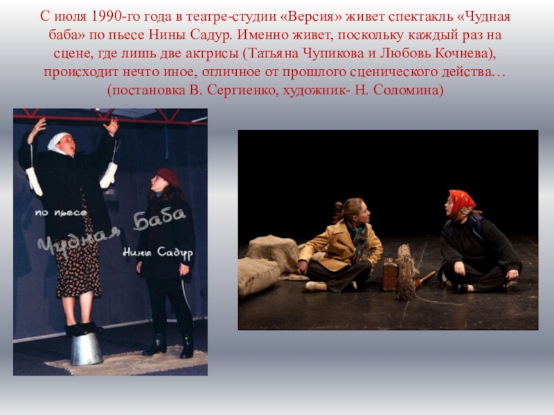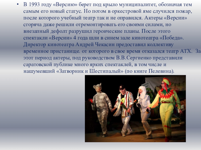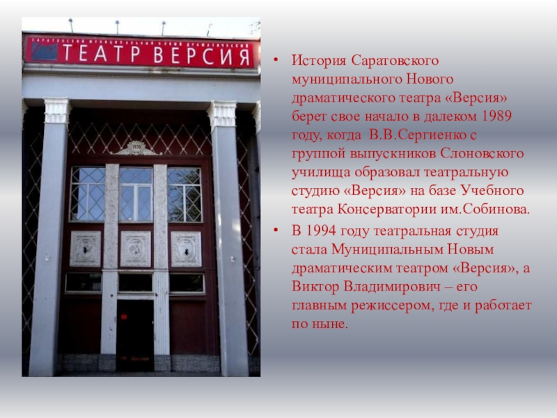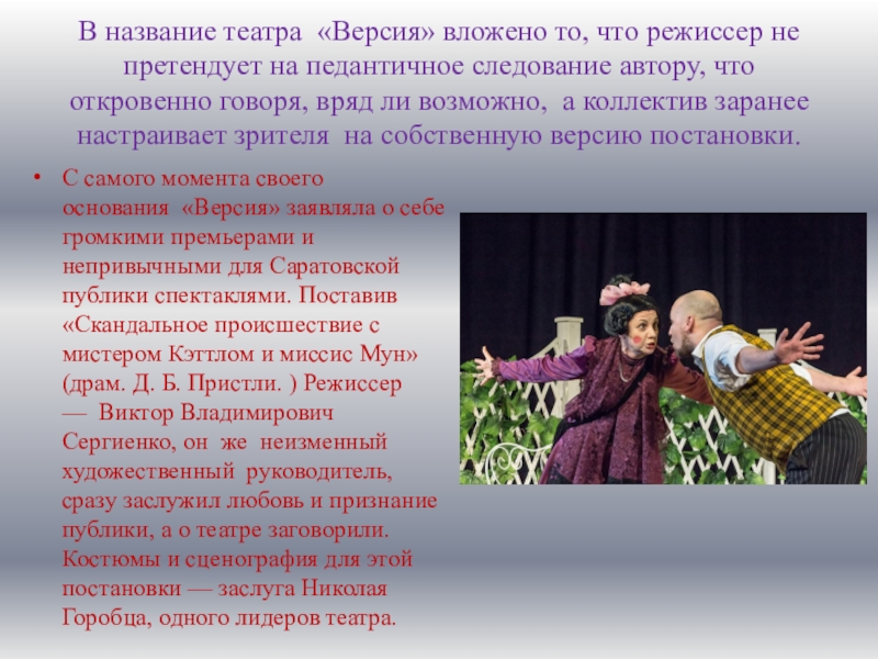 С самого момента своего основания «Версия» заявляла о себе громкими премьерами и непривычными для Саратовской публики спектаклями. Поставив «Скандальное происшествие с мистером Кэттлом и миссис Мун»(драм. Д. Б. Пристли. ) Режиссер — Виктор Владимирович Сергиенко, он же неизменный художественный руководитель, сразу заслужил любовь и признание публики, а о театре заговорили. Костюмы и сценография для этой постановки — заслуга Николая Горобца, одного лидеров театра.