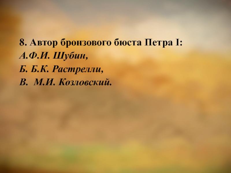 8. Автор бронзового бюста Петра I:А.Ф.И. Шубин,  Б. Б.К. Растрелли,    В. М.И. Козловский.