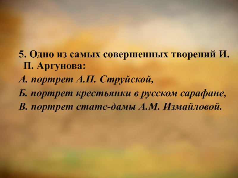 5. Одно из самых совершенных творений И.П. Аргунова:А. портрет А.П. Струйской,Б. портрет крестьянки в русском сарафане,В. портрет
