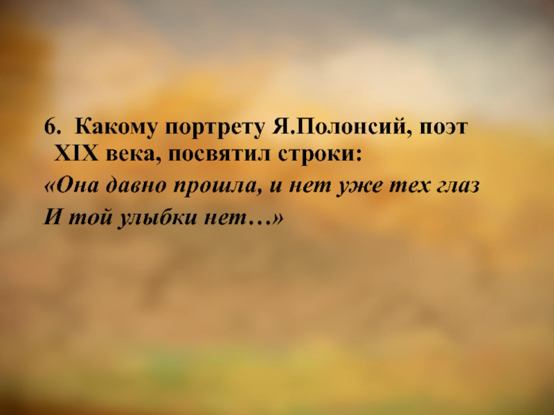6. Какому портрету Я.Полонсий, поэт XIX века, посвятил строки:«Она давно прошла, и нет уже тех глазИ той