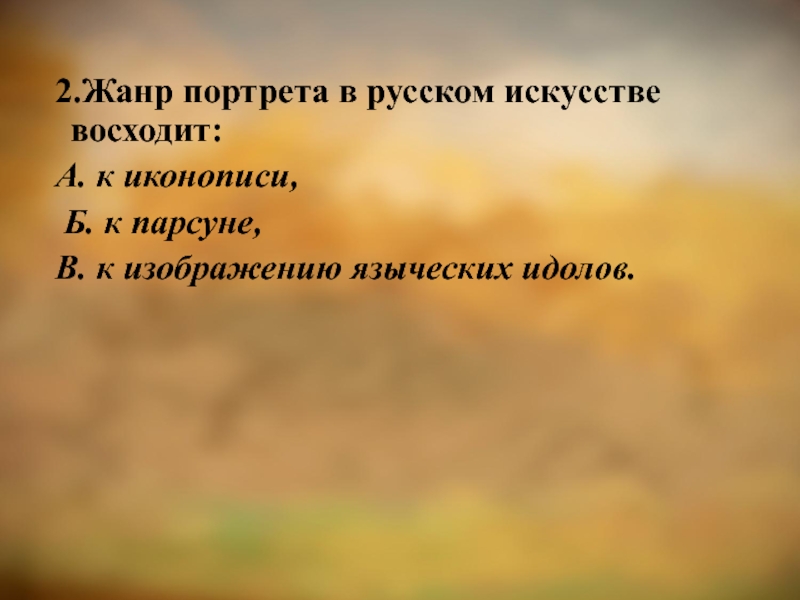 2.Жанр портрета в русском искусстве восходит: А. к иконописи,     Б. к парсуне,В. к
