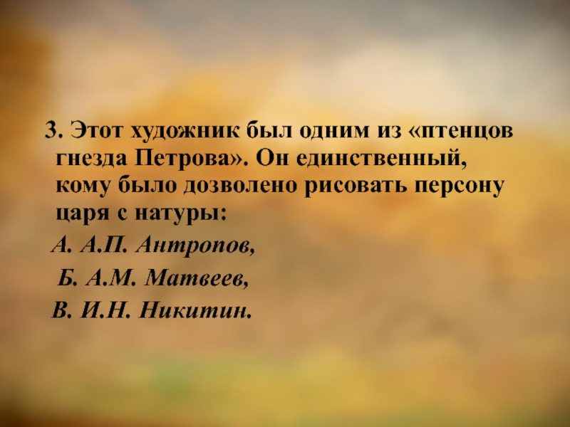 3. Этот художник был одним из «птенцов гнезда Петрова». Он единственный, кому было дозволено рисовать персону царя