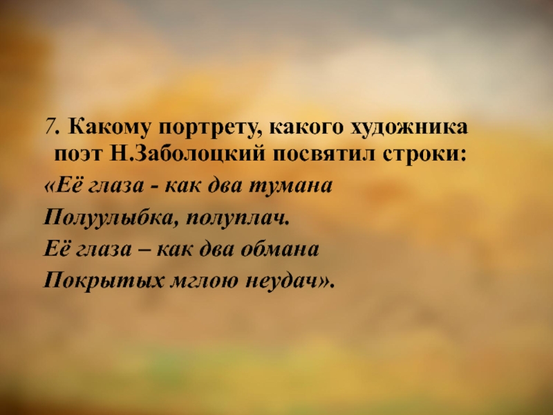 7. Какому портрету, какого художника поэт Н.Заболоцкий посвятил строки:«Её глаза - как два туманаПолуулыбка, полуплач.Её глаза –