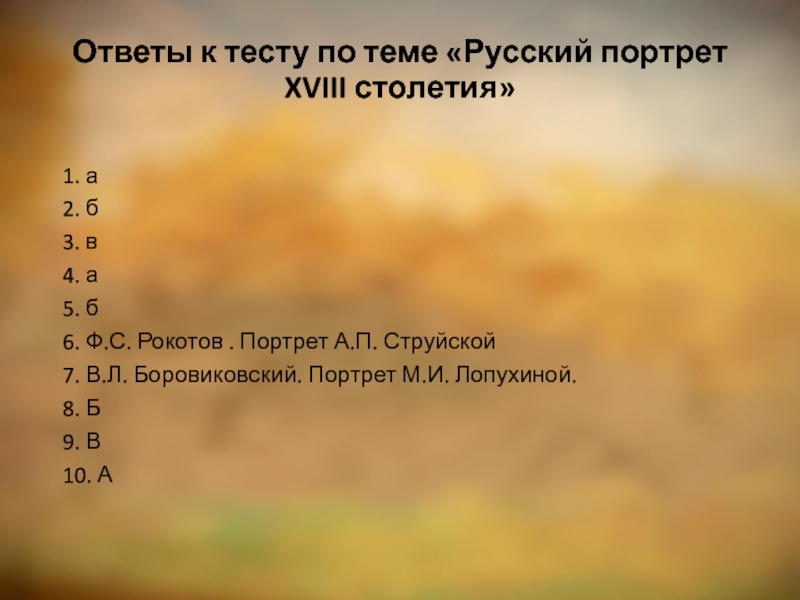 Слайд 12Ответы к тесту по теме «Русский портрет XVIII столетия»