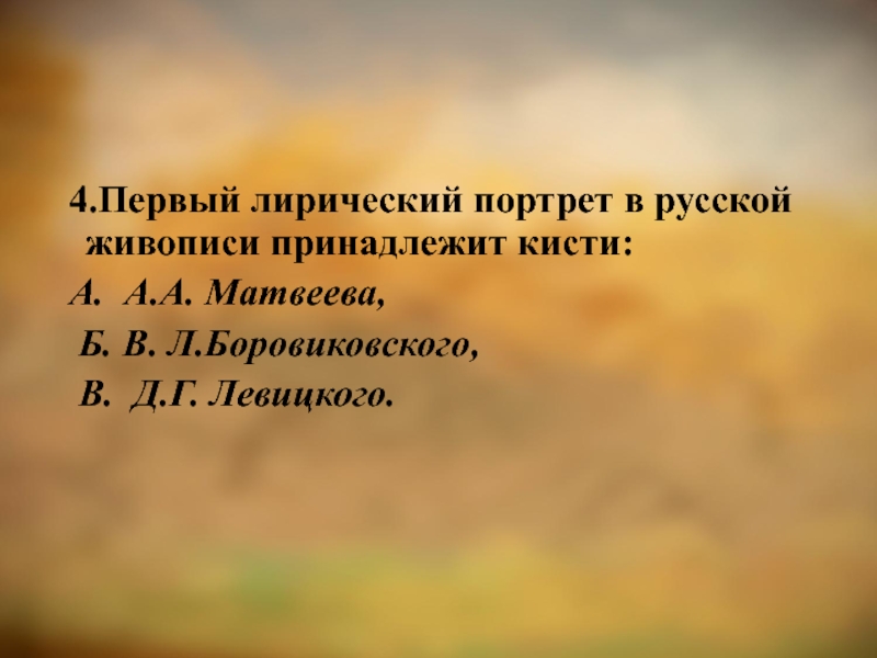 4.Первый лирический портрет в русской живописи принадлежит кисти:А. А.А. Матвеева,     Б. В. Л.Боровиковского,