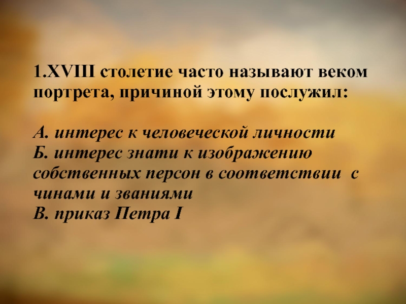 1.XVIII столетие часто называют веком портрета, причиной этому послужил:  А. интерес к человеческой личности Б. интерес
