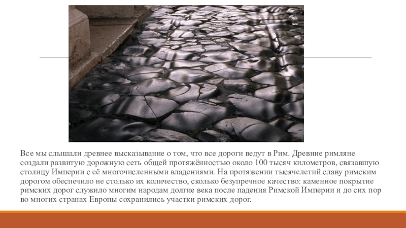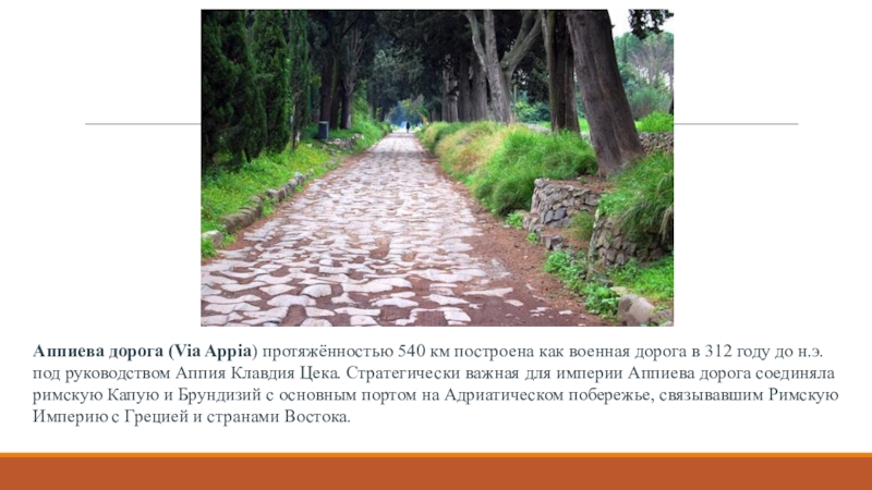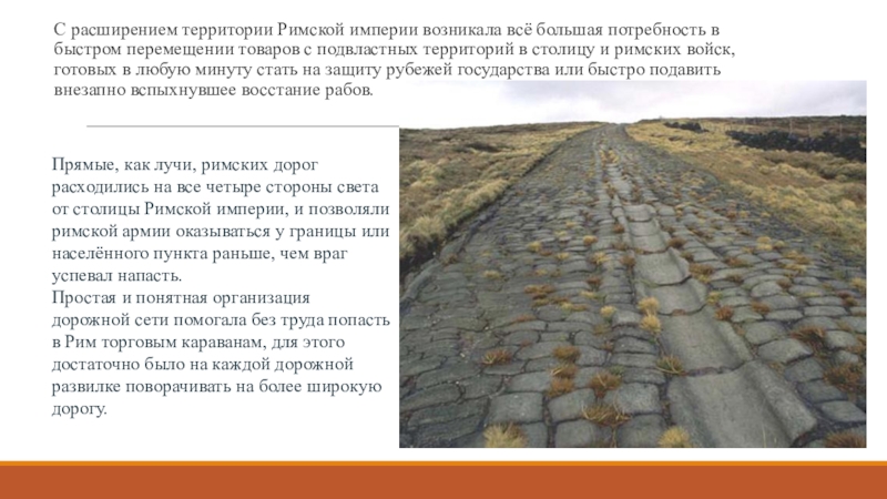 Прямые, как лучи, римских дорог расходились на все четыре стороны света от столицы Римской империи, и позволяли римской армии оказываться у границы или населённого пункта раньше, чем враг успевал напасть.