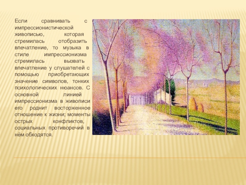 Слайд 6Если сравнивать с импрессионистической живописью, которая стремилась отобразить впечатление, то музыка