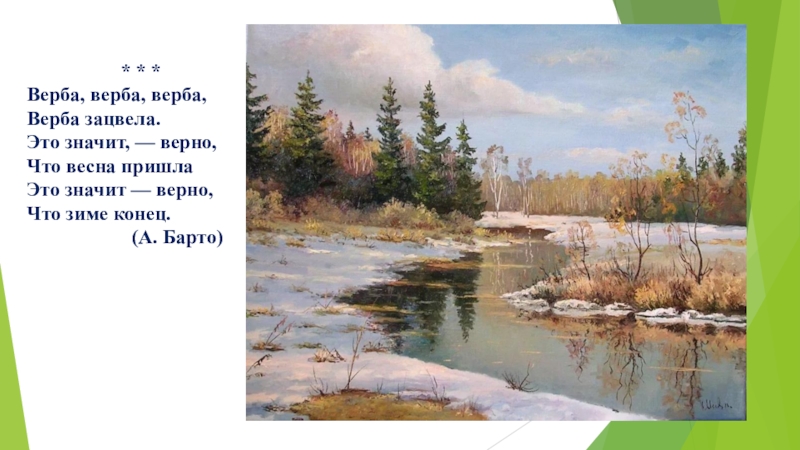 * * *Верба, верба, верба, Верба зацвела. Это значит, — верно, Что весна пришла Это значит — верно, Что зиме конец. (А. Барто)